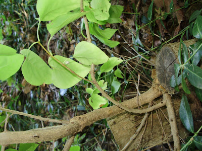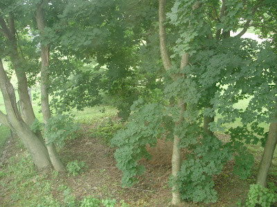 I walk gingerly to avoid some stubborn poison ivy. And note the lilac shoots, green and lush, that sprout from healed stumps still attached to their roots.