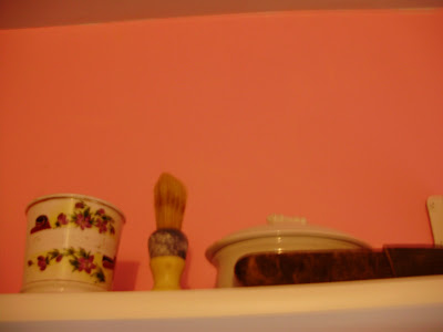 My husband’s grandfather’s shaving mug, straight razor, and shaving brush have temporarily found a home on a shelf above one window. Along with a dish that always sat on my mother-in-law’s dresser.