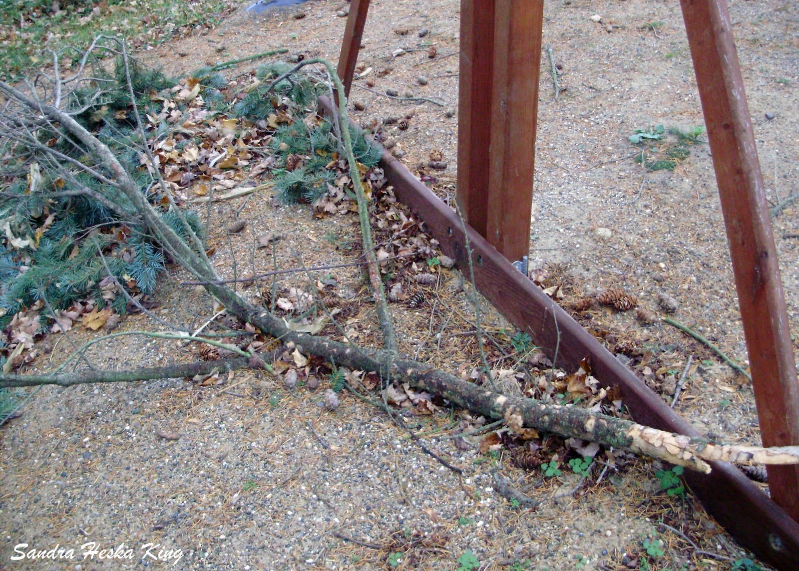 Branches litter the yard from yesterday’s wind, and leaves block the garage door. A political sign lies in the side yard.