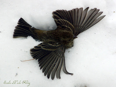 NOTE: This little bird crashed into our window and splatted into a snow angel. Three of us pressed our noses to the glass for several minutes–willing it to blink, to breathe, to move. Not until my husband and Gracee ran outside to its rescue, expecting to scoop it up to bury it, did it shake itself and fly off.